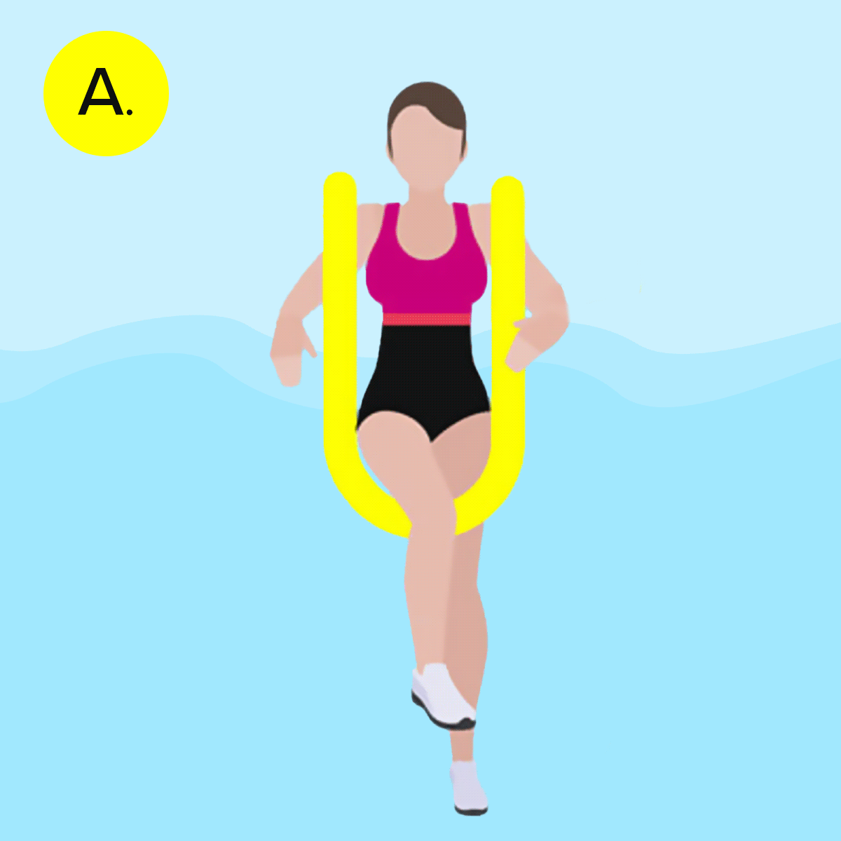 HOLD A POOL NOODLE AND STAND ON YOUR LEFT LEG, THEN PLACE THE NOODLE UNDERNEATH THE KNEE. THIS KEEPS THE LEG ELEVATED.