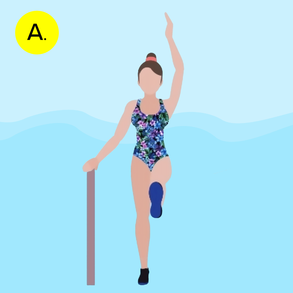 HOLD A POOL NOODLE ON EACH END AND PUSH IT UNDER THE WATER. LIFT ONE LEG AND PLACE THE NOODLE BEHIND THE ANKLE OR CALF MUSCLE.