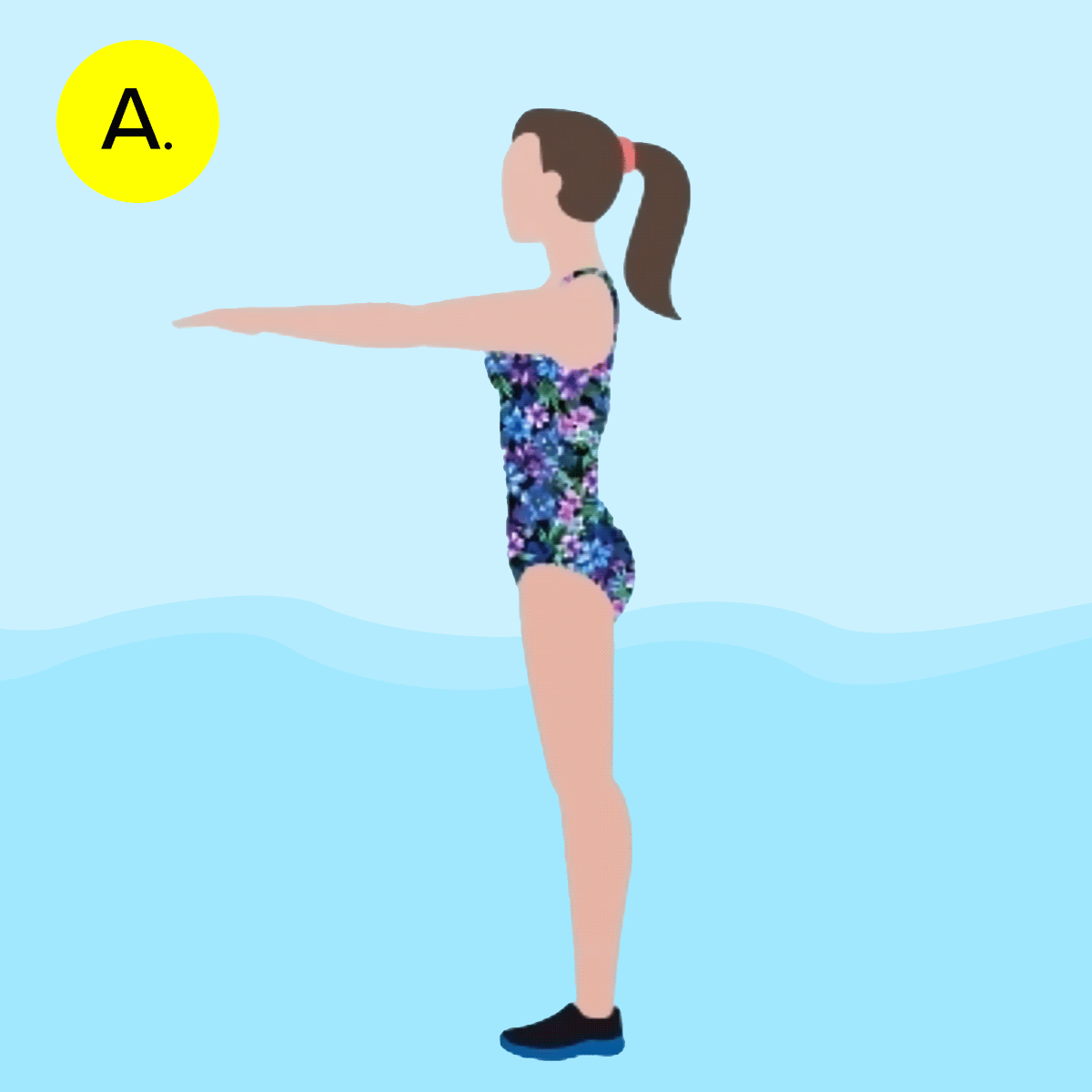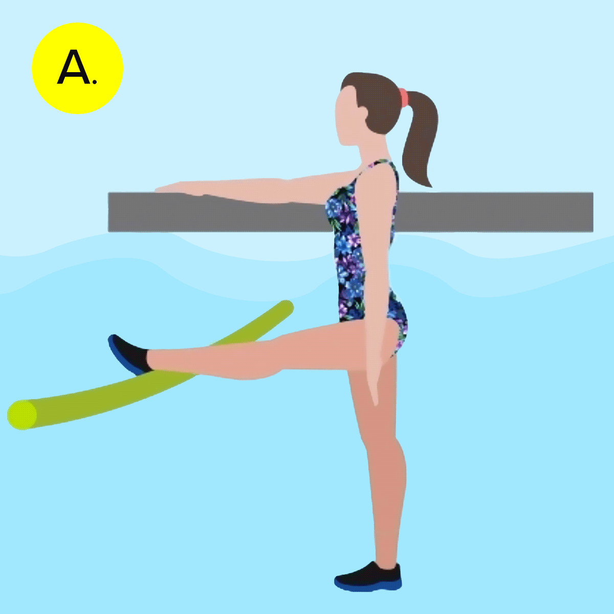 ALLOW THE NOODLE TO FLOAT UPWARD TOWARDS THE SURFACE TO FEEL A GENTLE STRETCH BEHIND THE LEG. HOLD THE STRETCH FOR ABOUT 30 SECONDS ON EACH LEG. REPEAT AS NEEDED.